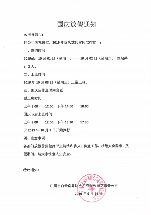 南粵防火門國慶放假通知